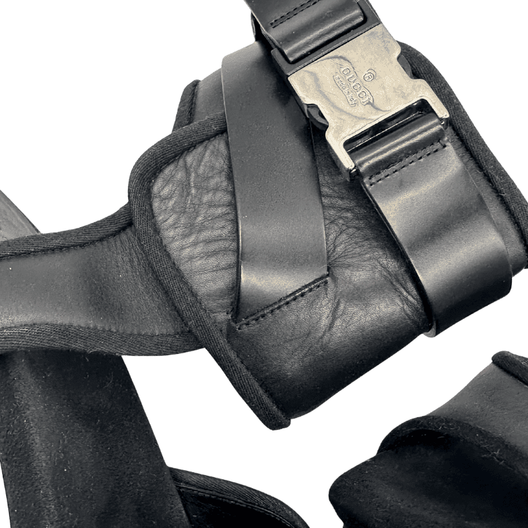 Juodi Gucci stiletto aukštakulniai su dirželiais aplink čiurną, pagaminti iš juodos odos. Turi verstos odos vidpadį, 10 cm aukščio stiletto kulną ir velcro užsegimą su sidabro spalvos sagtimi.