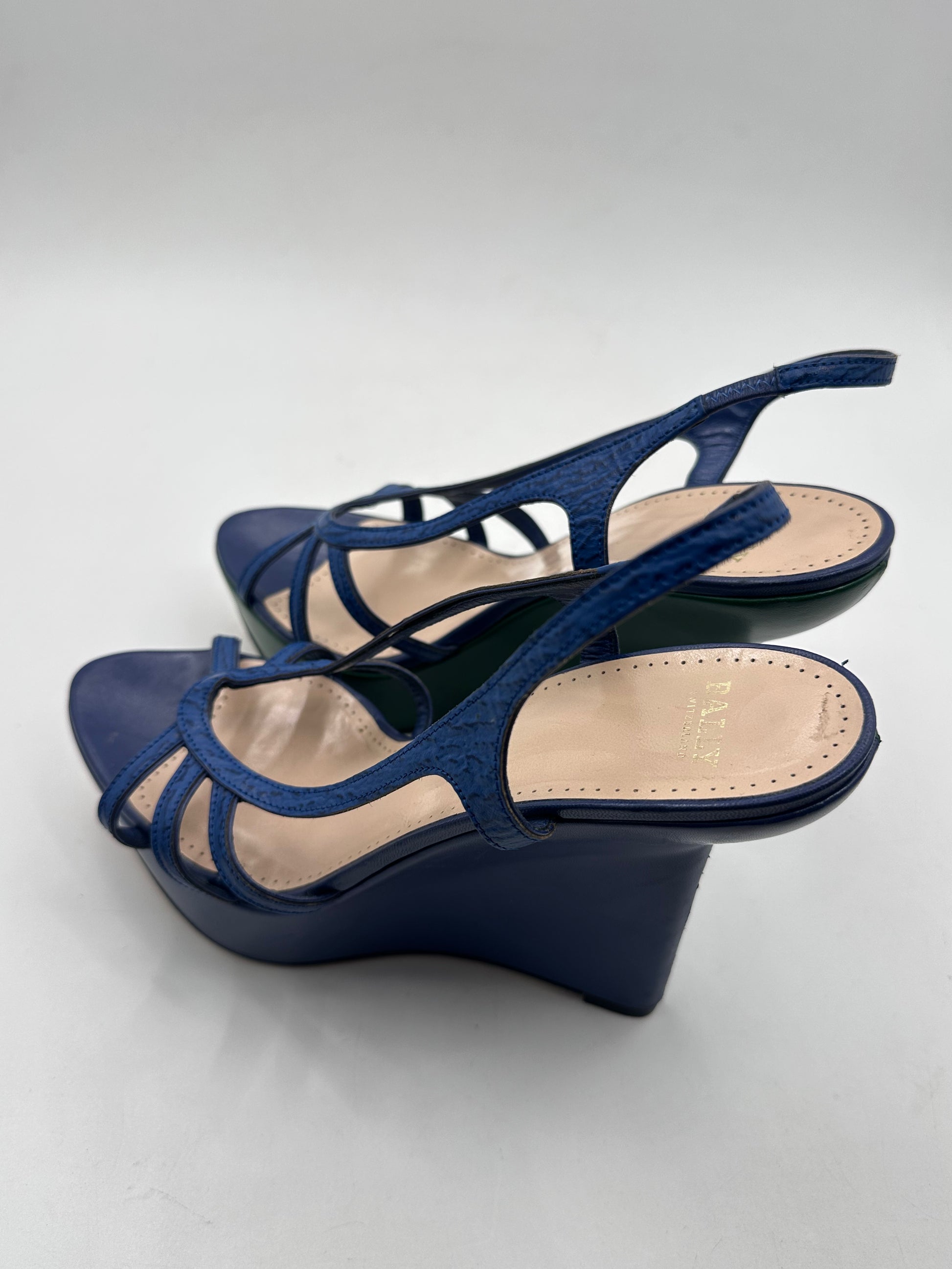 Tamsiai mėlynos ir žalios spalvos odiniai Bally Athalia aukštakulniai su čiurną juosiančiais dirželiais.