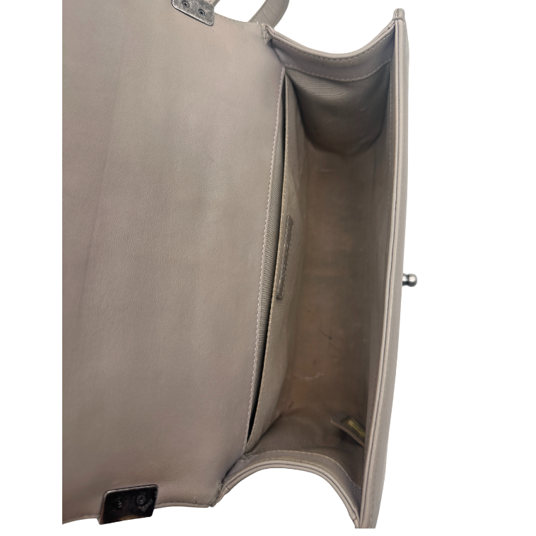 Ši Chanel Boy Bag rankinė pagaminta iš pilkos lygios odos su sendinto sidabro detalėmis. Rankinė turi užsegamą dalį su CC sagties logotipu ir reguliuojamą dirželį. Komplekte yra Chanel hologramų lipdukas, originali dėžė ir dulkių maišelis.