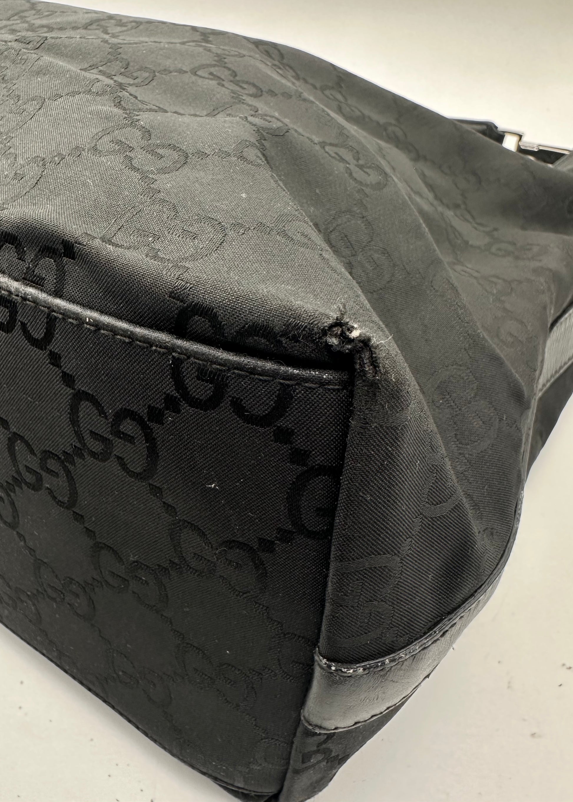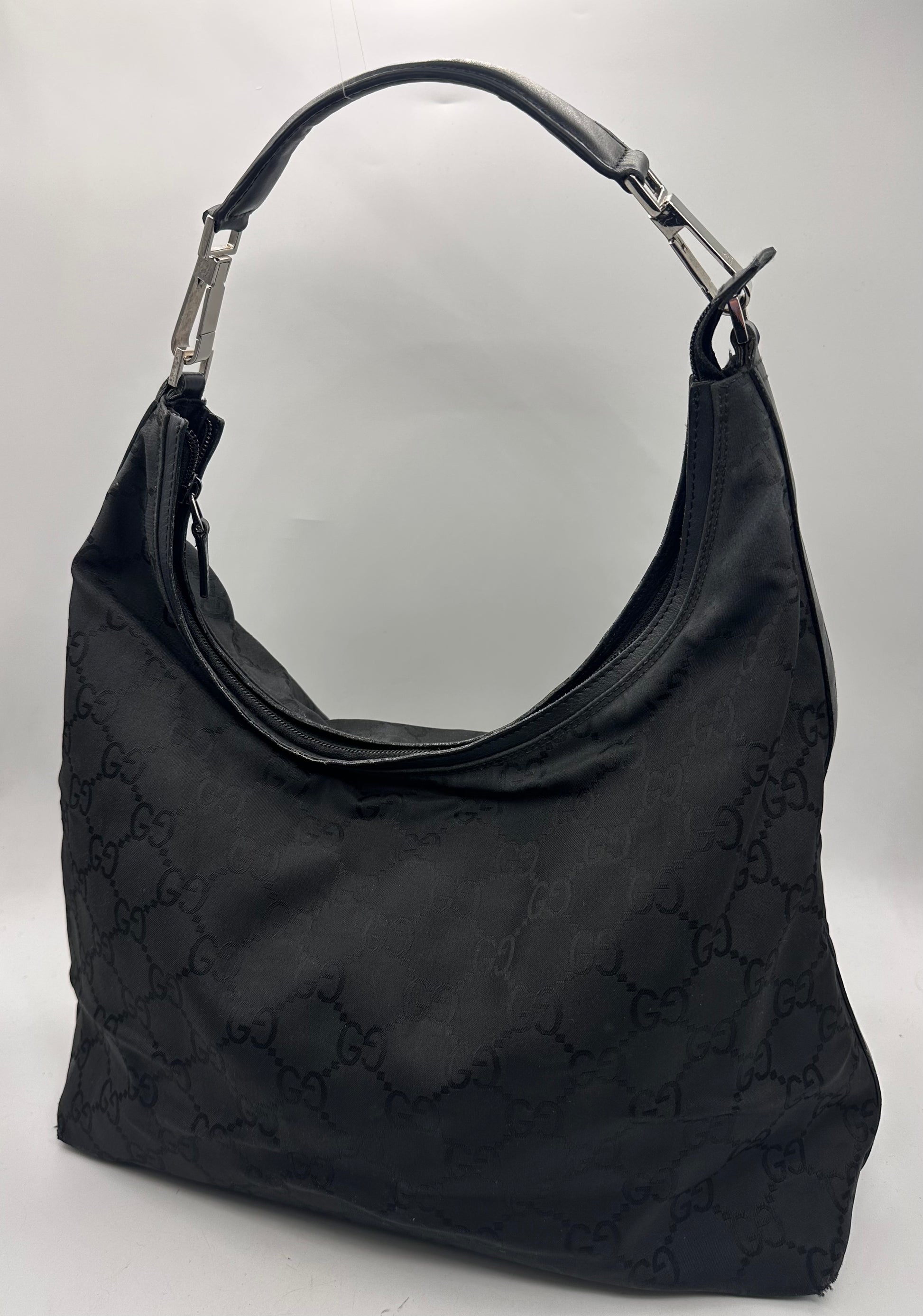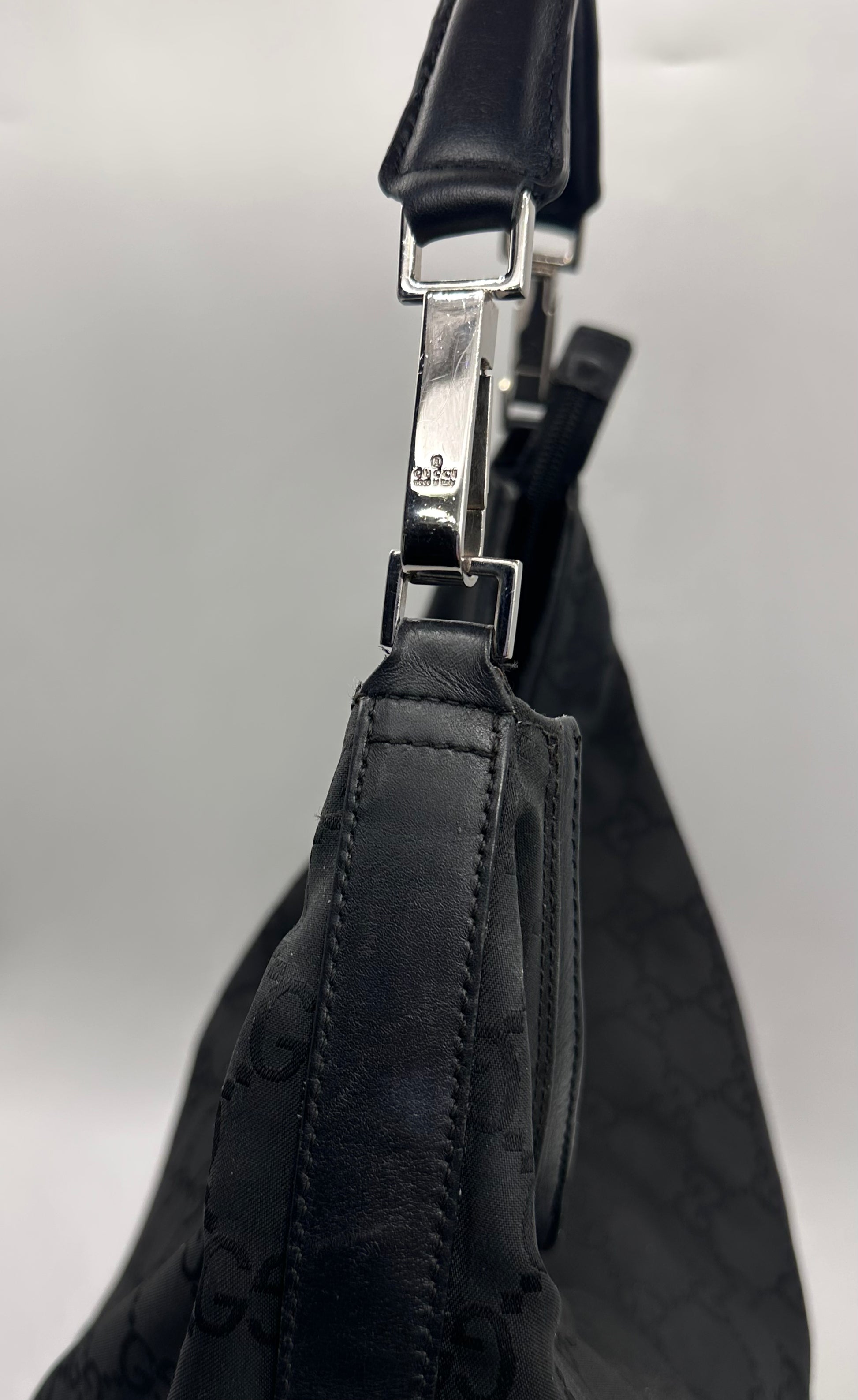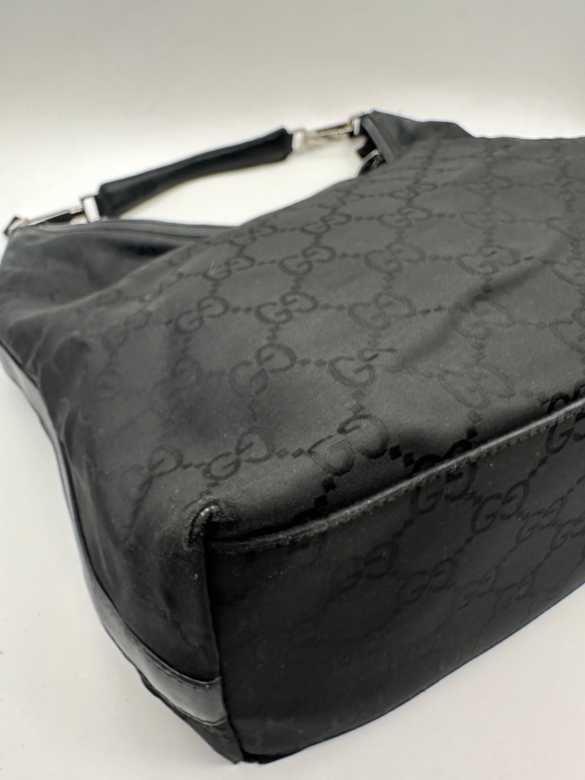 Didelė Gucci GG Hobo rankinė iš nailono su sidabro spalvos detalėmis.