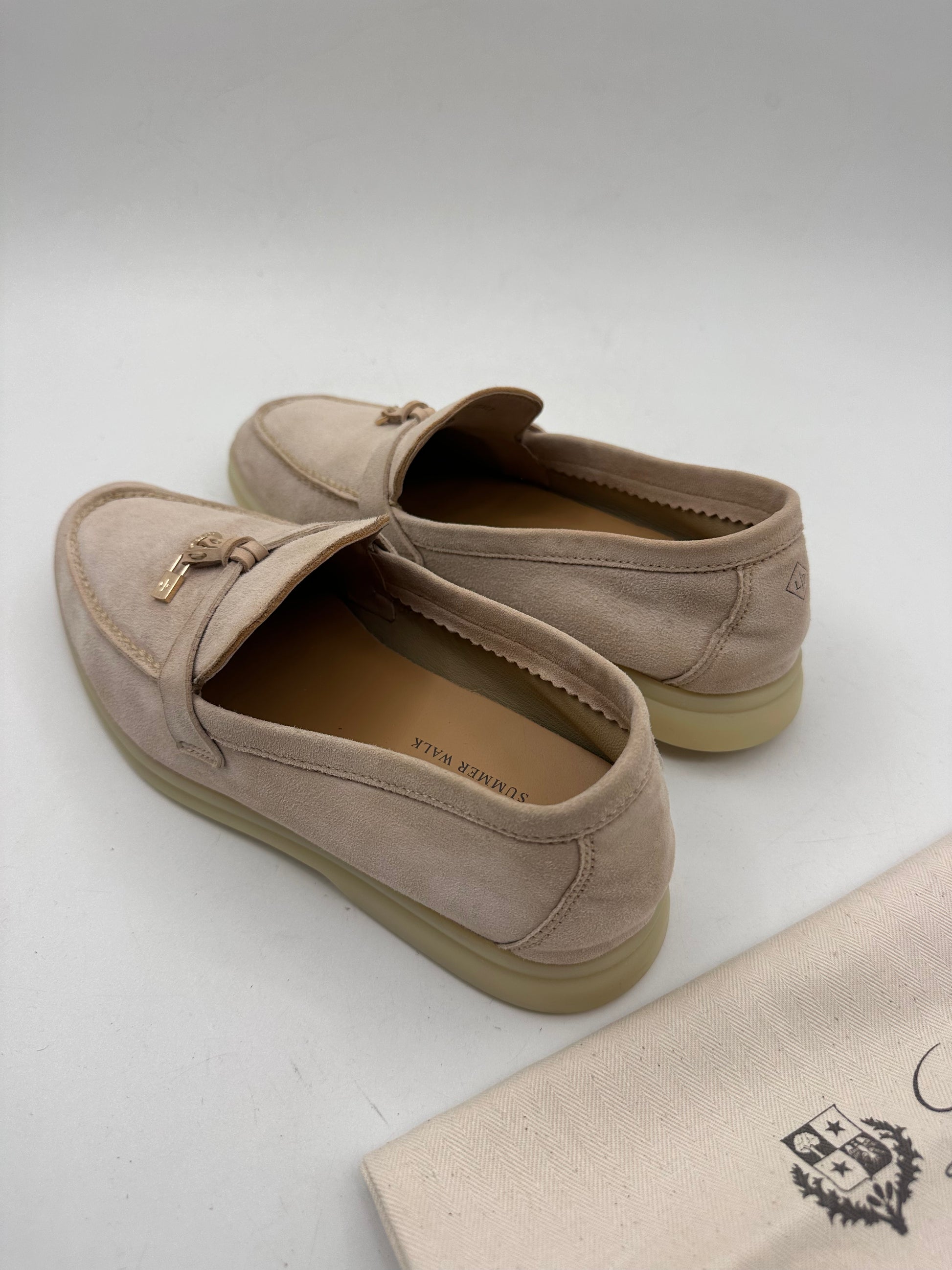 Smėlio spalvos Loro Piana Summer Charms Walk mokasinai iš verstos odos, su auksinio atspalvio detalėmis ant dirželio.