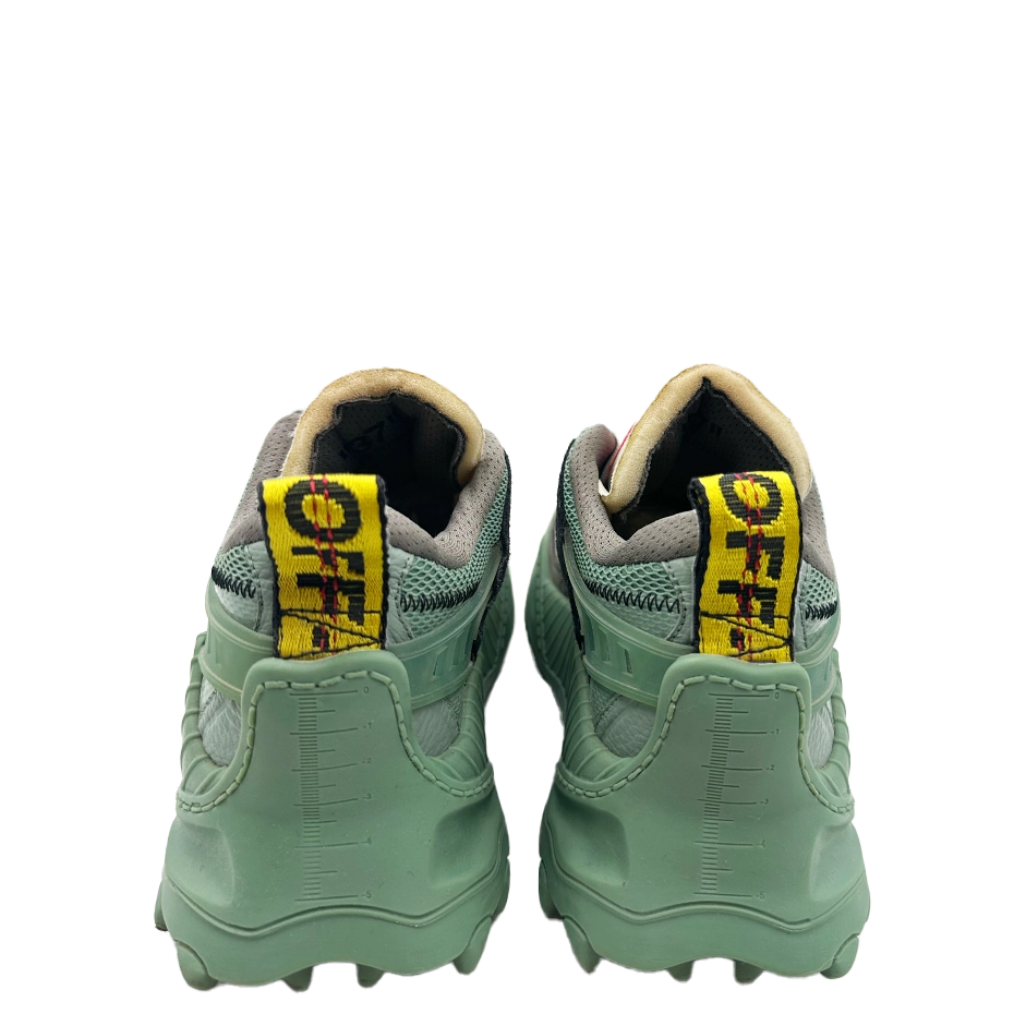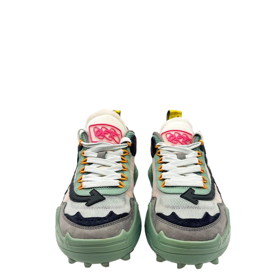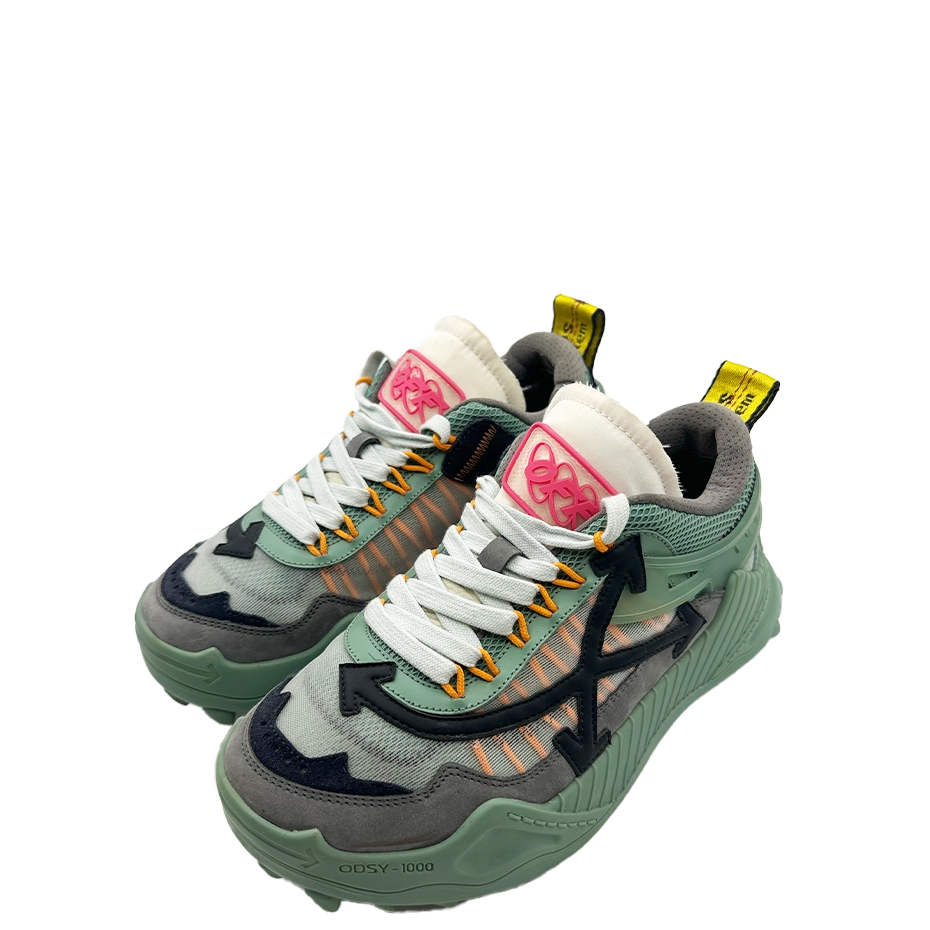 Off-White Odsy-1000 kedai išsiskiria savo chunky siluetu ir dygliuotu padu. Šis modelis yra tamsesnės mėtų spalvos su oranžinės, mėlynos, pilkos ir juodos spalvos detalėmis.