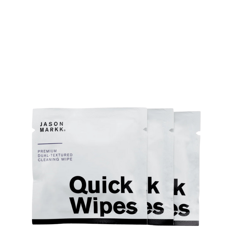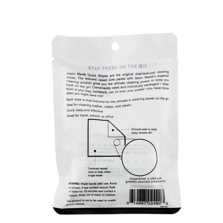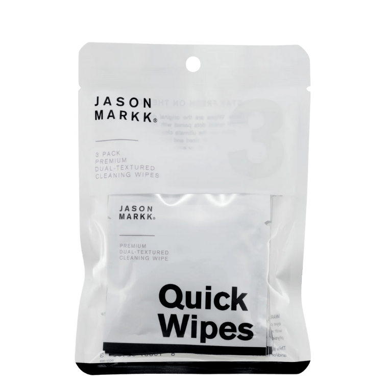 Jason Markk Quick Wipes (3 vnt.) – drėgnos, tekstūruotos servetėlės, sukurtos greitai pašalinti purvą. Kiekviena servetėlė supakuota atskirai, todėl lengva nešiotis rankinėje, automobilyje ar kišenėje.